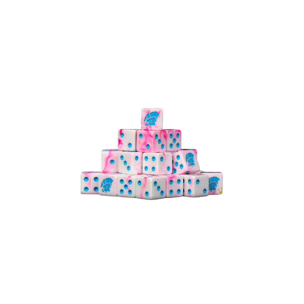 Die sich ständig verändernde, die sich ständig anpassende Alien Horde kommt! Diese enthalten eine rein weiße Harzbasis, wirbelnd von fluoreszierenden rosa gemischt im Inneren, um ein himmlisches Gebräu zu schaffen und mit cerulean hellblau eingelegt; Harz 16mm Würfel. Die Symbole befinden sich auf der 6er Seite.