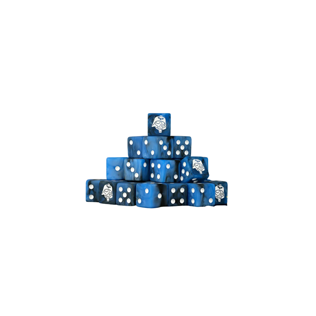 Sühne, Brüder. Diese enthalten eine Mischung aus einer radioaktiven Kombination von düsteren Blautönen, die mit Adern von verbranntem Schwarz verwirbelt sind, mit einer matten Oberfläche und einem knackigen Weiß; Harz 16mm Würfel. Die Symbole befinden sich auf der 6er Seite.