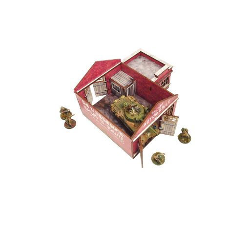 Mehrfarbig vorlackiertes (UV-bedrucktes) einstöckiges WW2-Normandie-Garagen- und Tankstellengebäude mit begehbarem farbigem Innenraum und abnehmbarem Dach. Vorgeschnittene transparente Acryl-Fensterplatten enthalten. Option zum Aufbau mit offenen oder geschlossenen Türen, die während des Spiels geöffnet und geschlossen werden können. Platz für ein mittelgroßes bis großes Fahrzeug oder einen ganzen Infanterietrupp im Inneren. Zwei Benzinverteiler enthalten.