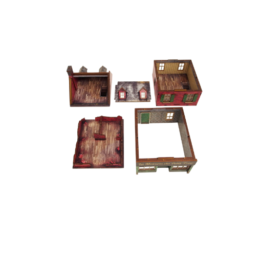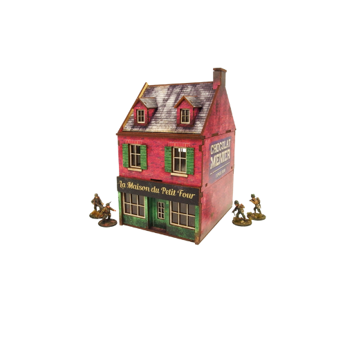 Mehrfarbig vorlackiertes (UV-bedrucktes) 3-stöckiges WW2 Normandie Cafe-Gebäude mit begehbaren farbigen Innenräumen, herausnehmbaren Ebenen und abnehmbarem zerstörtem Erdgeschoss. Platz für eine ganze Infanterieeinheit im Inneren. Vorgeschnittene transparente Acryl-Fensterscheiben enthalten. Zusammenbau mit offenen oder geschlossenen Fensterläden und Türen möglich. Optionales Hinweisschild enthalten.
